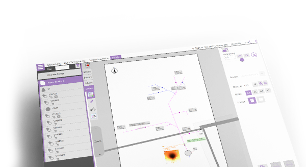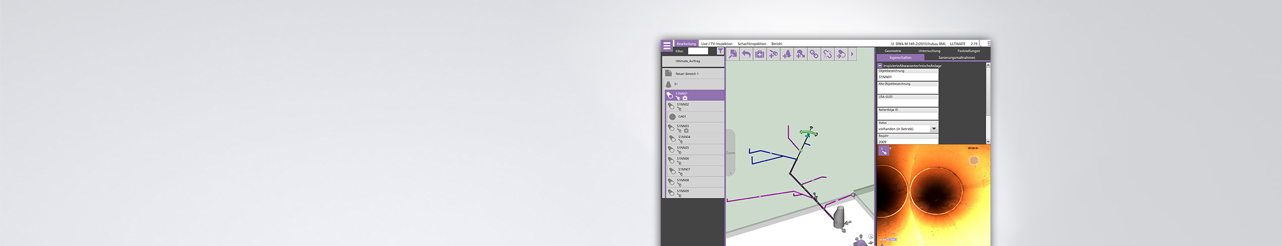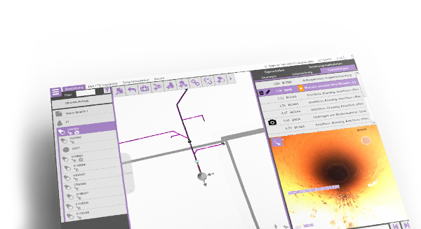 Der Verlauf der Leitung wird bei der Inspektion durch Eingaben oder Sensoren erfasst und das vollständige Rohrleitungsnetz in 3D neben dem Live-Bild angezeigt. Hinterlegte Pläne und Zeichnungen gewährleisten eine perfekte Orientierung.