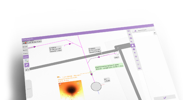 Auch das 3D-Modell des Rohrnetzes ist bis zum Schluss vollständig editierbar. Falsch erfasste Bögen und Abzweige können berichtigt werden. Mit nur wenigen Mausklicks lassen sich Verbindungen zwischen Leitungen, Haltungen, Schächten und Entwässerungsgegenständen herstellen.