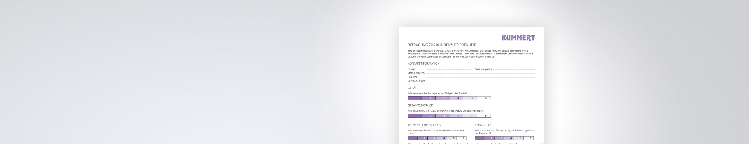 Wir würden uns freuen, wenn Sie sich einige Minuten Zeit nehmen um uns mitzuteilen, wie Zufrieden Sie mit unserem Service-Team sind. Die Bewertung erfolgt im Schulnotensystem. Füllen Sie einfach unser Online-Formular aus oder laden Sie sich das Formular als PDF herunter und senden Sie den ausgefüllten Fragebogen an kundenzufriedenheit@kummert.de